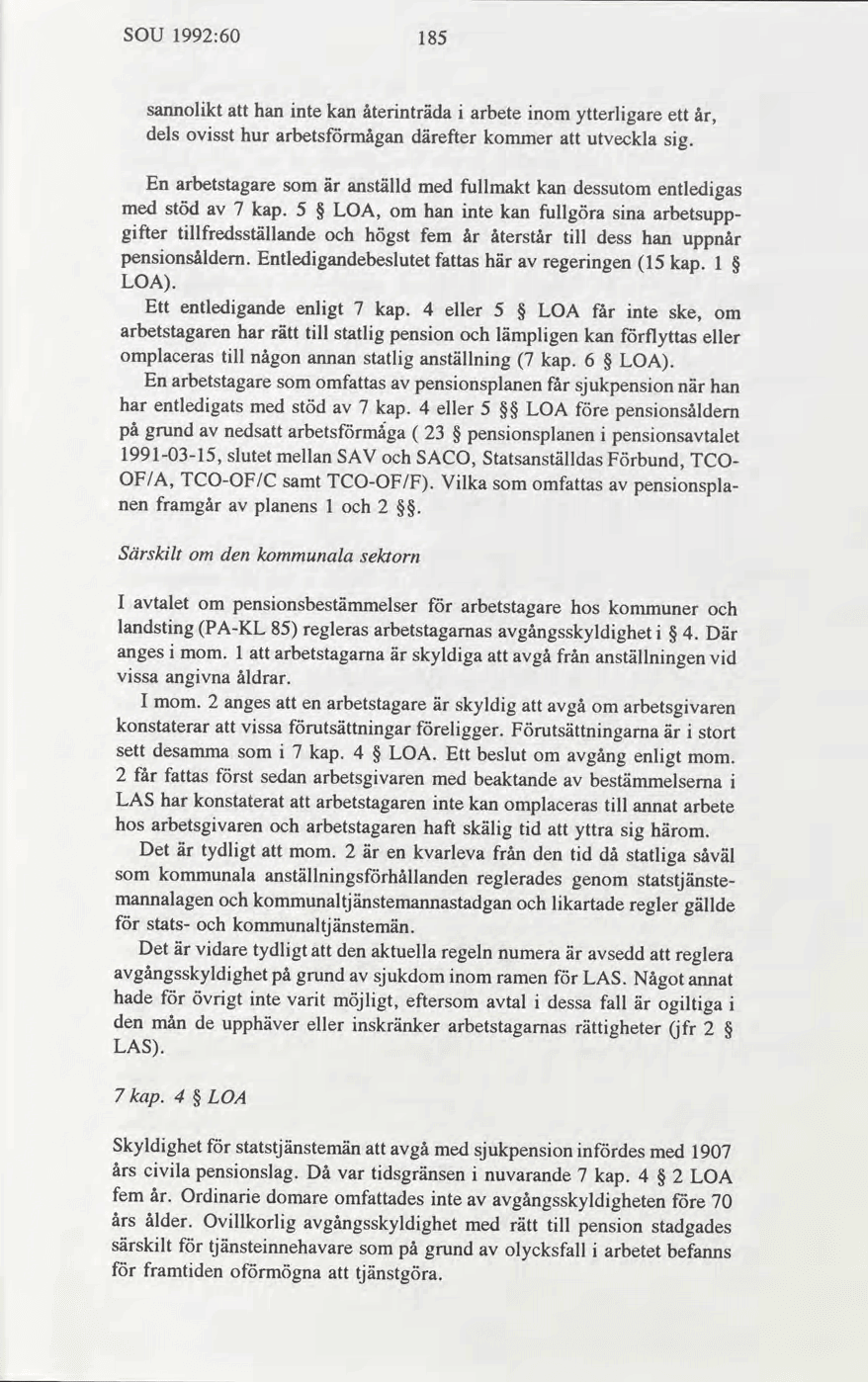 Reglerna i 7 kap. 4 § LOA och därtill anknytande regler måste antas tjäna två syften. De syftar dels till att tillgodose allmänhetens och arbetsgivarmyndighetens intresse av att statliga tjänster inte innehas av personer som på grund av sjukdom framöver är oförmögna att utöva tjänsten eller att utöva den på ett riktigt sätt. De syftar emellertid också till att skydda arbetstagarna; de kan inte skiljas från anställningen utan att detta framstår som sakligt välmotiverat och utan att deras försörjning är tryggad.