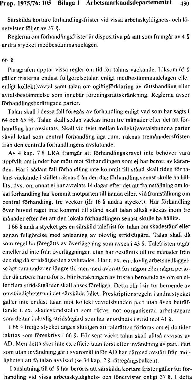 ] s. 223 [ ]). Arbetsdomstolen har dock brukat uppfatta preskriptionsregler i annan arbetsrättslig lagstiftning – t.ex. 40 § i den äldre lagen (1974:12) om anställningsskydd och 68 § lagen (1976:580) om medbestämmande i arbetslivet – som materiellrättsliga regler, detta trots att det i förarbetena till den sistnämnda lagen (prop. 1975/76:105 [ pdf ||