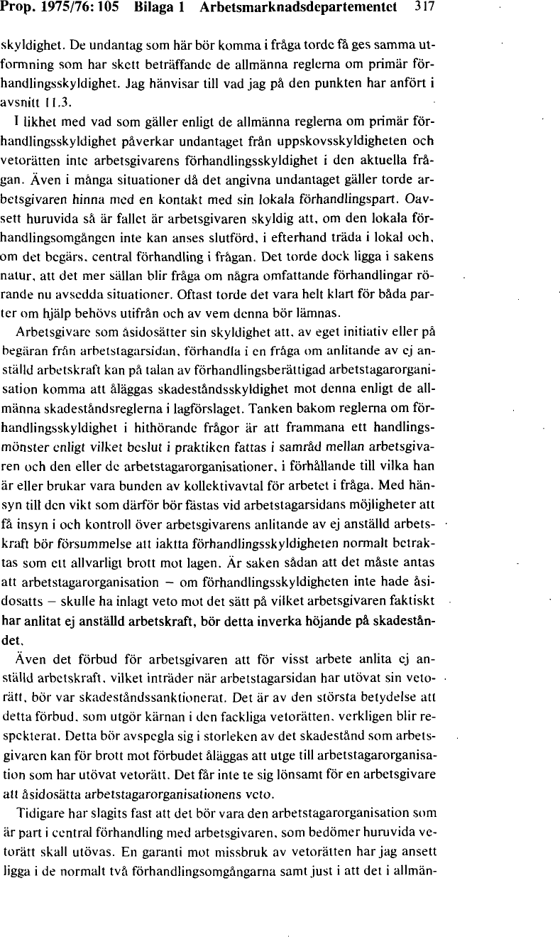 Med hänsyn till vikten av att arbetstagarsidan ges möjligheter att få insyn i och kontroll över arbetsgivarens anlitande av utomstående arbetskraft bör en arbetsgivares försummelse att iaktta förhandlingsskyldigheten normalt betraktas som ett allvarligt brott mot lagen. I fall då omständigheterna är sådana att det måste antas att arbetstagarorganisationen – om förhandlingsskyldigheten inte hade åsidosatts – skulle ha inlagt veto mot det sätt på vilket arbetsgivaren faktiskt har anlitat ej anställd arbetskraft, bör detta inverka höjande på skadeståndet (prop. 1975/76:105 [ pdf ||