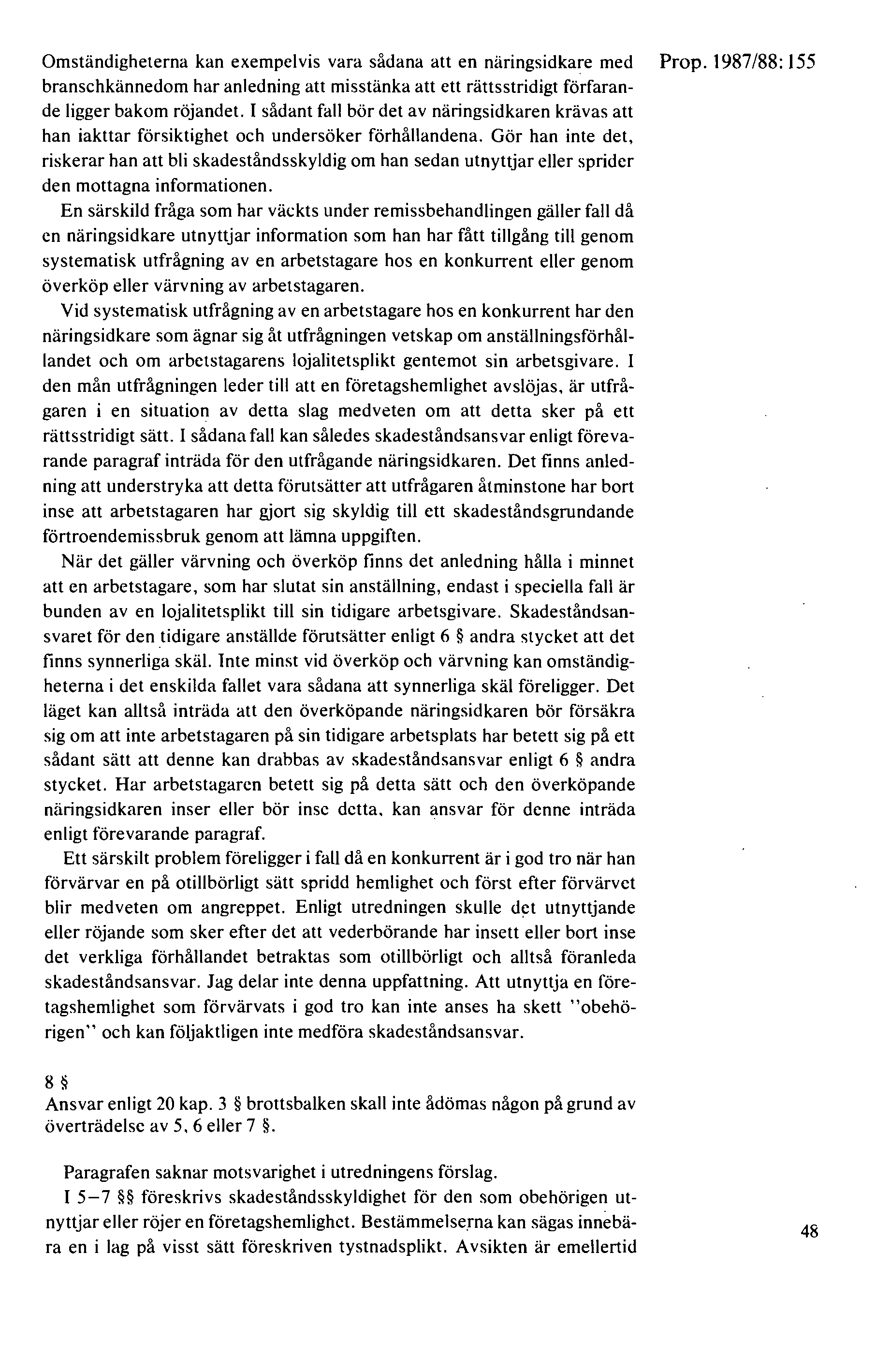 Av 8 § FHL följer att den som uppsåtligen eller av oaktsamhet utnyttjar eller röjer en företagshemlighet enligt vad han eller hon inser eller bör inse, har angripits enligt denna lag ska ersätta den skada som uppkommer genom hans eller hennes förfarande. Förutom att angreppet ska ha skett uppsåtligen eller av oaktsamhet krävs således för ansvar enligt denna bestämmelse att det obehöriga utnyttjandet eller röjandet av företagshemligheten har skett med insikt om det tidigare olovliga angreppet enligt FHL. Enligt motiven kan omständigheterna vara sådana att en näringsidkare med branschkännedom har anledning att misstänka att ett rättsstridigt förfarande ligger bakom röjandet och att det i sådana fall bör krävas av näringsidkaren att han iakttar försiktighet och undersöker förhållandena för att han inte ska riskera ett skadeståndsansvar om han senare utnyttjar eller röjer den mottagna informationen. (Prop 1987/88:155 [ pdf ||