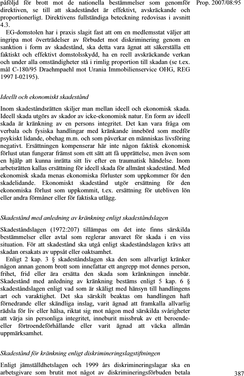 Av artikel 9 EKMR framgår bl.a. att var och en har rätt till tankefrihet, samvetsfrihet och religionsfrihet. Genom att tanke- och samvetsfrihet nämns vid sidan av religionsfrihet görs klart att konventionen skyddar såväl religiösa som icke religiösa livsåskådningar (Danelius, Mänskliga rättigheter i europeisk praxis, fjärde upplagan sid. 417) Religion eller annan trosuppfattning är en självständig diskrimineringsgrund i DL vilket har framgått av prövningen ovan. Genom diskrimineringsersättningen ersätts ideell skada vid brott mot förbuden mot diskriminering och repressalier m.m. Ersättningen beskrivs i förarbetena som en påföljd där ersättningen ska avse den kränkning som överträdelsen innebär (prop. 2007/08:95 [ pdf ||