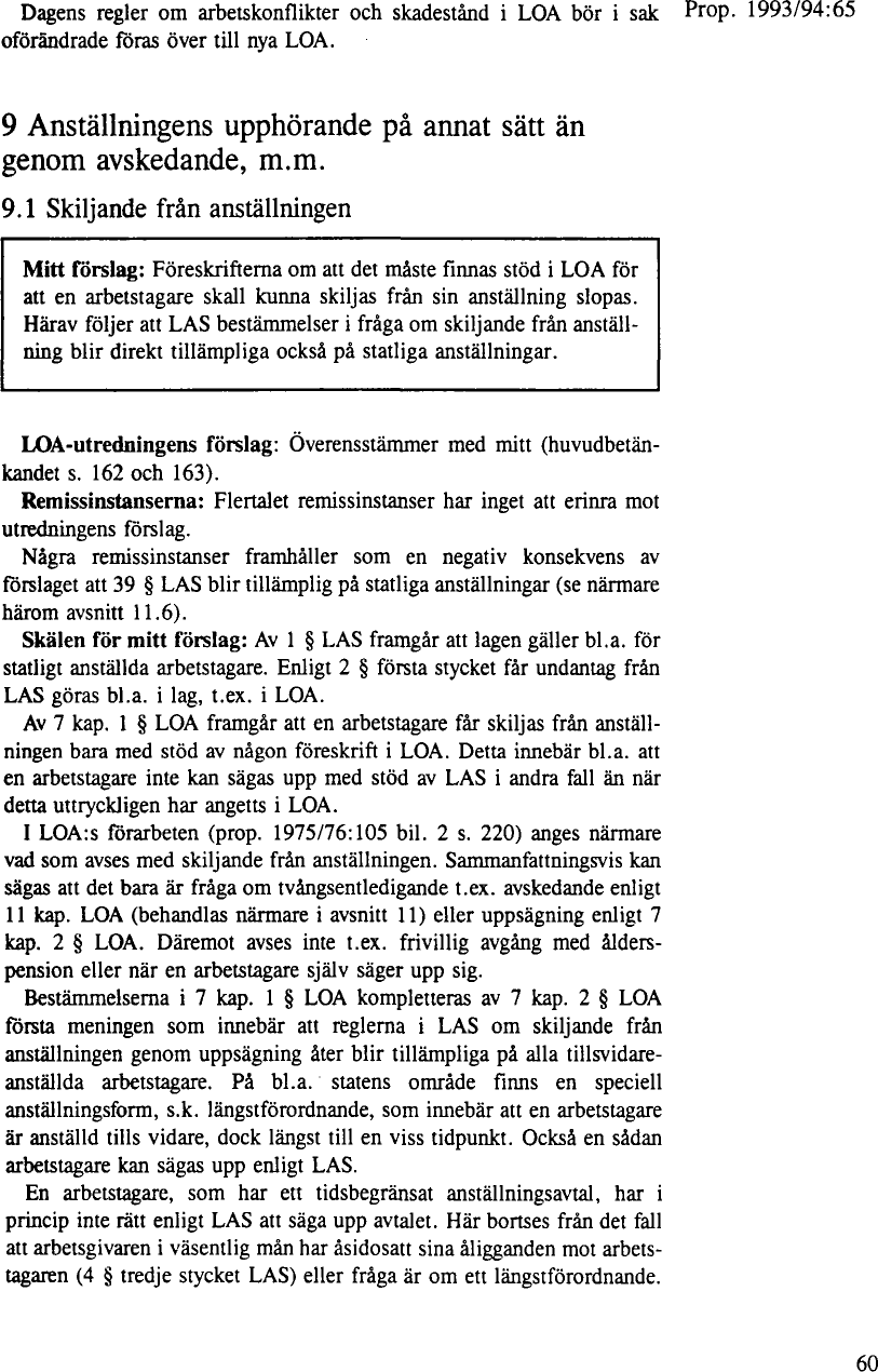 I 1976 års lag om offentlig anställning infördes i 7 kap. regler om anställnings upphörande på annat sätt än genom avskedande och där intogs en bestämmelse om att arbetstagare fick skiljas från anställningen endast med stöd av föreskrift i lagen varvid bl.a. hänvisades till uppsägningsreglerna i anställningsskyddslagen såvitt avser arbetstagare som är förordnade tills vidare (prop. 1975/76:105, [ pdf ||