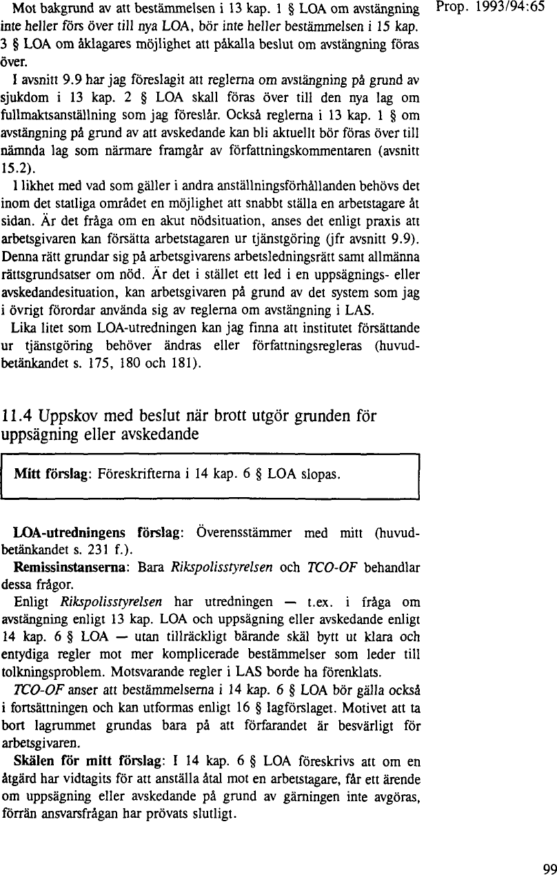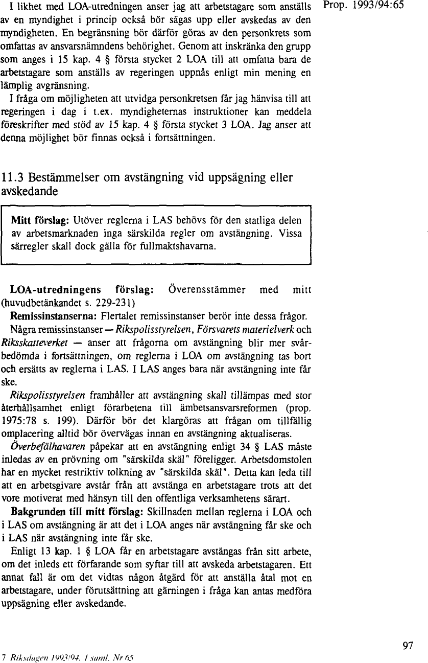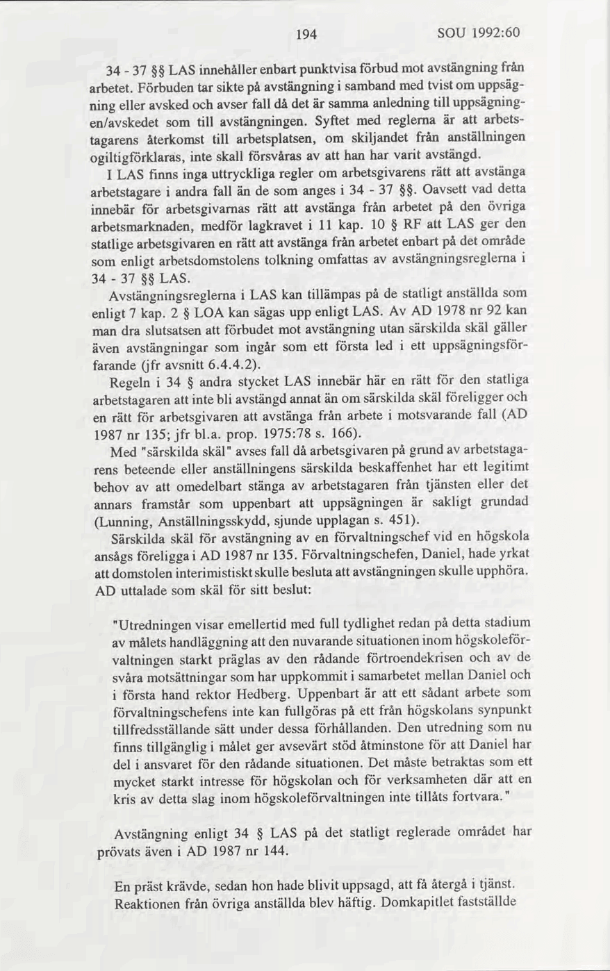 ] s. 97 [ ] f.). I motiven hänvisas till AD 1978 nr 92 [ NJ ] och det anförs att domstolen kom fram till att avstängningsförbudet, dvs. regeln om särskilda skäl för avstängning, måste anses tillämpligt också på avstängningar som ingår som ett första led i ett uppsägningsförfarande. I den utredning som föregick 1994 års LOA angavs att lagkravet i dåvarande 11 kap. 10 § regeringsformen ger den statlige arbetsgivaren en rätt att stänga av en arbetstagare enbart på det området som enligt Arbetsdomstolens tolkning omfattas av avstängningsreglerna i 34–37 §§ anställningsskyddslagen (SOU 1992:60 [ pdf | ], s. 194 [ ]).