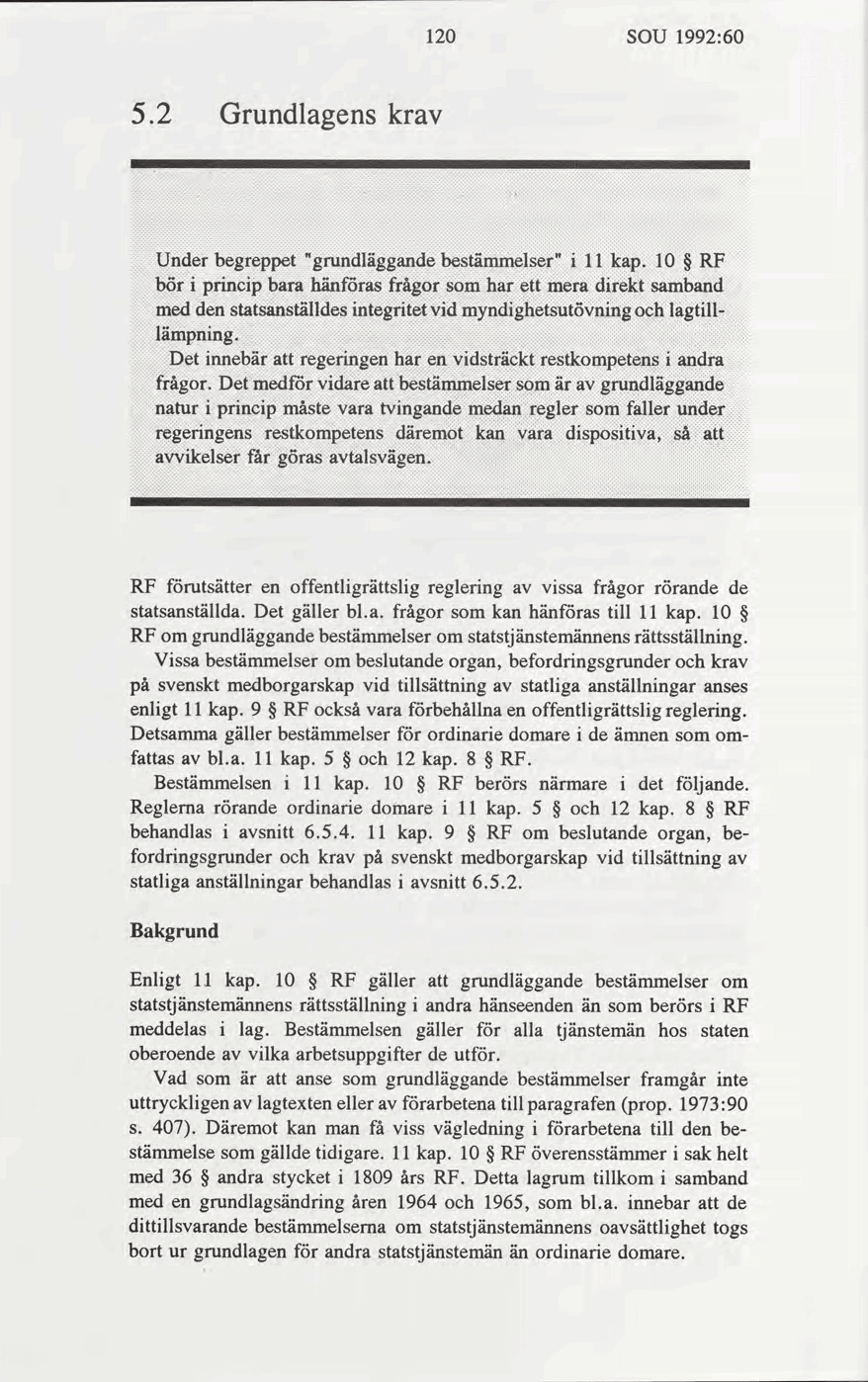 Frågan är vad som omfattas av begreppet ”grundläggande bestämmelser om statligt anställdas rättsställning”. Frågan har berörts i flera utredningar och andra förarbeten. Som exempel har angetts t.ex. tjänstetillsättning, disciplinär bestraffning och anställningens upphörande (se prop. 1964:140 [ pdf ||