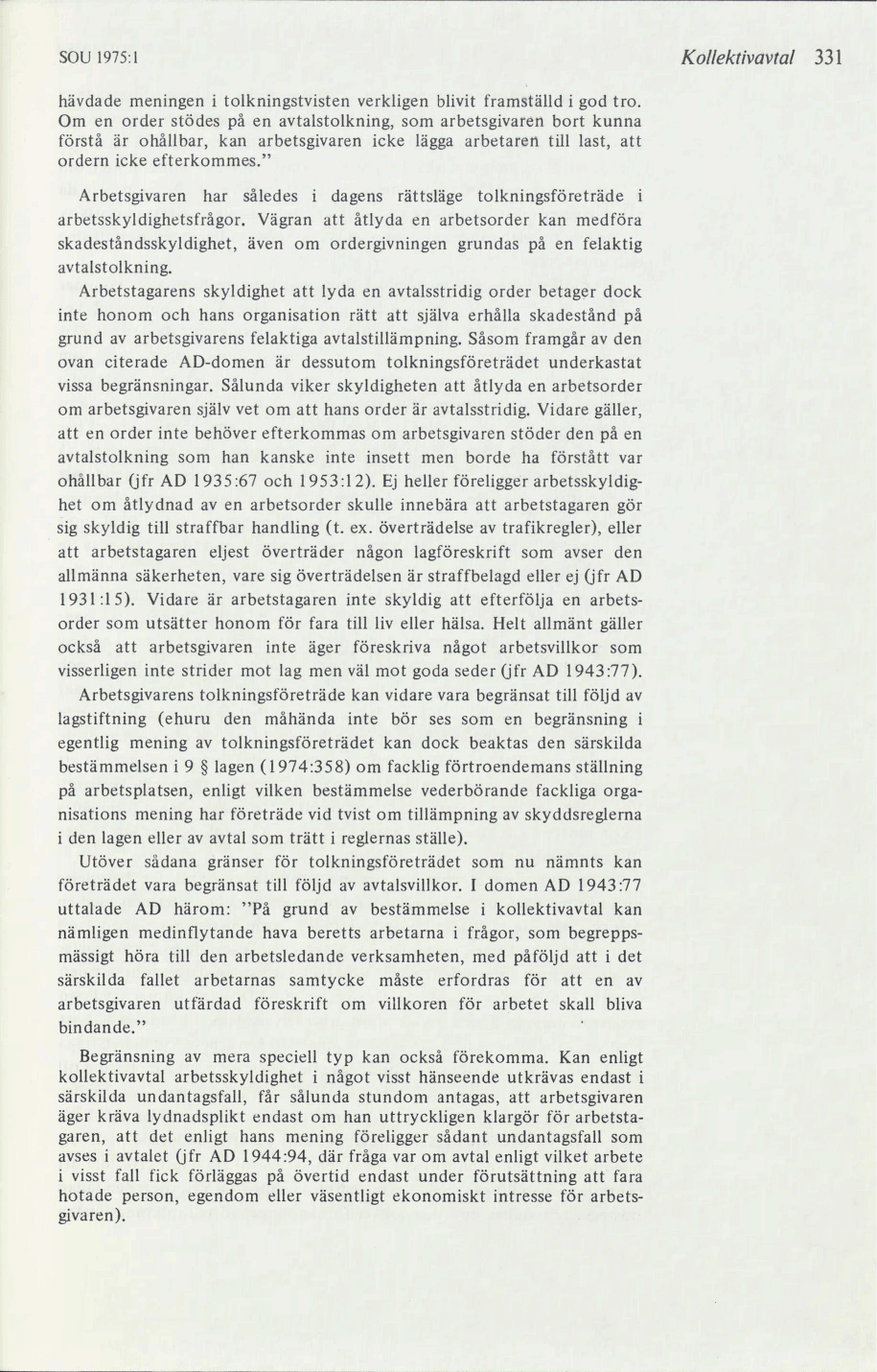 Inom arbetsrätten gäller sedan gammalt att arbetstagaren i princip är skyldig att följa en order av arbetsgivaren om att arbeta, även om han eller hon anser att arbetsgivaren inte har avtalsenlig rätt att ge en sådan order (AD 1934 nr 179). Principen har kommit att kallas för arbetsgivarens tolkningsföreträde i tvister om arbetsskyldighet. Det finns dock flera undantag från den principen. I tvister om arbetsskyldighet enligt avtal har det i lag införts ett tolkningsföreträde för kollektivavtalsbärande arbetstagarorganisationer som tar över arbetsgivarens (34 § medbestämmandelagen). Har ett sådant tolkningsföreträde inte utövats gäller dock arbetsgivarens tolkningsföreträde och arbetstagaren är i princip skyldig att lyda, om inte annat följer av kollektivavtal. Arbetstagaren är emellertid inte skyldig att följa en order (jämför 34 § andra stycket sista meningen medbestämmandelagen och SOU 1975:1 [ pdf | ] s. 331 [ ], den utredning som föregick medbestämmandelagen)